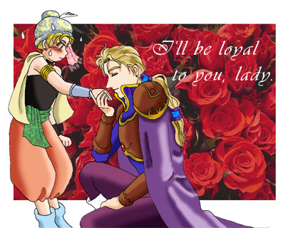 …さすがに犯罪ですってば(笑)。でもってこの後、似顔絵描かれてオートボウガンでハチの巣にされると。これぞ落書き、なんせ身長比較という単語を無視しているので絶対にバランスがとれていないハズです。だいたい王様が忠誠誓ってどうすんじゃ。しかし前回も思いましたが、IV描く時はクリアカラーを使うのにVI描く時は中間色ばっかりになるようです、私。それに私の場合、IVではこのテのギャグ絵が描けないので(エッジでもなぁ…ここまでキザいマネできねぇだろ)気分転換によろしいようです。